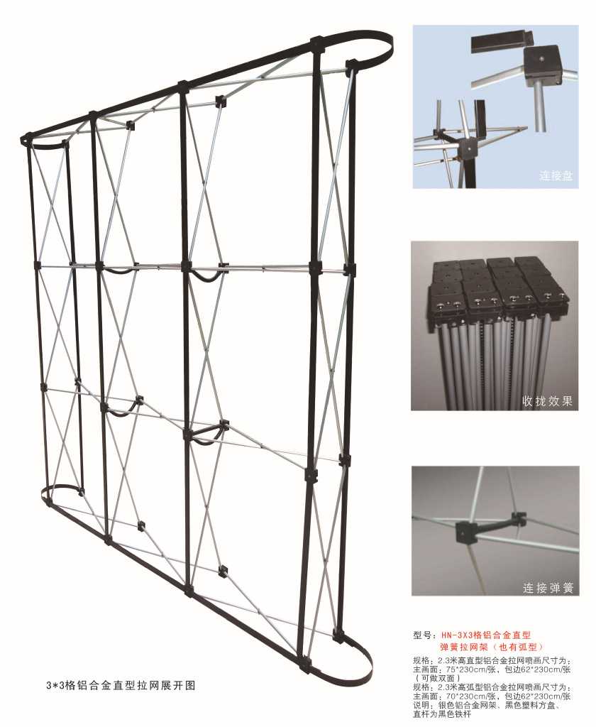 拉网展架可用于国内外参展、开会,携带方便,有独立的航空箱可空运,架体采用强力磁铁结构与优质铝合金材料制造而成,幅面大方美观.安装简单一拉自动吸锁成型,即使一个没有操作过此类产品的人,看完安装图纸以后也可在20分内钟独自完成。拉网展架有直型,弧形,S型,还可由此衍生出来各种组合如WING型,直角等。直型拉网展架、弧型拉网展架、S型拉网展架,高度一般为2.3米,宽度可以按固定宽度(直型75CM,弧形70CM)加宽。一般3*3M标准展位背景使用一套3*3直型拉网展架是正好合适的。这里有一个误区,我们的3*3直型拉网展架,实际尺寸是高2.3M,安装完成整体宽度(加两侧包边)约2.8米,而不是3*3M,拉网展架的3*3说的是横着三排,竖着三列。如果要加宽展架,只能以一列两列这样的方式来加宽,而不能任意宽度。拉网展架画面是一列一列拼接起来的,所以整个大幅画面可以卷起来装在拉杆箱中,很方便携带。操作简单,适用于各地巡回展会会议背景。长期以来受到广大客户的青睐。拉网展架是十分方便,但是仍然有局限性。以一个3*3拉网展架来说,一整套的重量约为23KG,如果不用拉杆箱携带很不方便,而如果使用航空拉杆箱,仅这个箱子本身就有15KG的重量。另外,它画面是分段拼接起来的,整体并没有浑然一体的感觉。 .jpg)