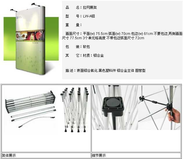 拉网展架用简洁、现代的线条,架起不同的画面,拉网展架尺寸灵活的大小规格,展开面积大,而收起来的体积小,便于携带,是到不同城市巡回展览时的最佳选择,拉网展架规格组装简便,形式、颜色多样,布拉网是展销中独特的精品。拉网架轻巧、美观;采用特制磁吸式贴画技术,另配射灯、PVC板、磁条及便携式包装配套;有直型、弧型自由选择,可任意组合,让你的展示陈列光彩夺目。