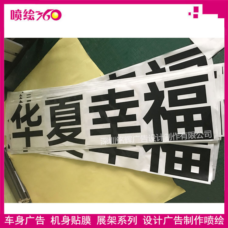 即时即贴刻字制作过程是首先喷绘,把整个喷绘材料车身贴单一色的喷出色彩,一般我们常见的色彩有红、蓝、绿,其实可以喷绘很多不同你想要的色彩的;然后就是过膜,这层膜的主要作用是防水防晒不易脆等保护,继续是切割,采用刻字机把字体的尺寸大小切刻出来,弄好刻字环节需要时间和人手慢慢撕下不要的地方,最后一步是留下字体后用转移膜转移到想要的地方,如玻璃上、汽车车身上等等。
