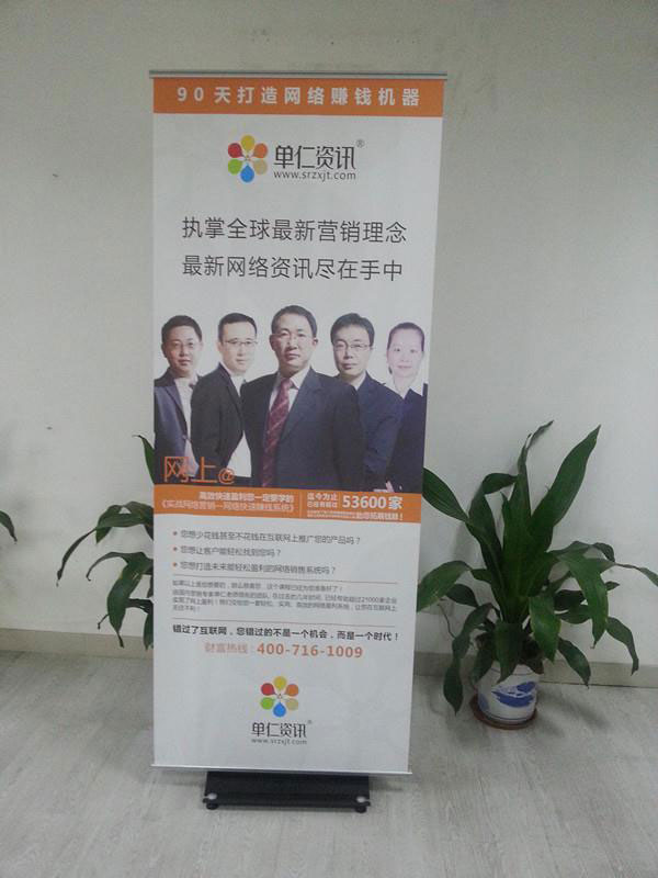 易拉宝在平时我们也比较常见,在街头的临时摊位或者超市的宣传广告上都可以见得到,一种疏离的宣传海报,外出携带也方便,打开时只需一根棍子在后撑住即可/