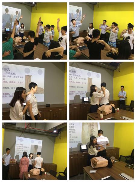 课程有CPR现场心肺复苏术的操作方法、职业性疾病预防和治疗、穴脉按摩,现场老师的专业演讲,员工的实习操作,错误解答调整,耐心的让所有员工感受的自身有要改善地方和如何缓解改善;一堂课下来,大家都增长一些小知识,比如穴脉按摩这环节,有些人常常因为打电脑导致肩膀腰部酸痛着,老师现场教会我们几招穴脉按摩的地方,让我们在平常生活中,可以为自己为大家人按摩缓解舒筋。