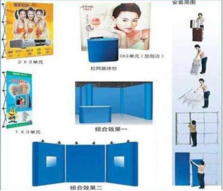 拉网展架画面种类繁多,拉网展架画面可以使用背胶裱PVC胶片,灯布喷绘,布拉网,热转印拉网展架等作为画面,拉网展架按尺寸分:3X3M、3X4M、3X5M、3X6M;4X3M、4X4M、4X5M,可以根据需要定做。标准配置:3X3M;24根铁条,31米磁条,12米胶板,5公斤牛津布大布袋;黑色。