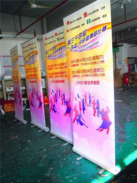 易拉宝由合金材料造型简练 ,易拉宝造价便宜轻巧便携,易拉宝不仅方便运输,携带,且存放安装简易,操作方便,易拉宝又经济实用,可多次更换画面,是商家的不可缺少的宣传物品.